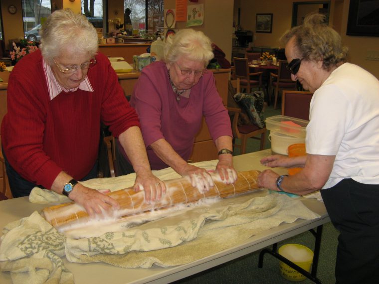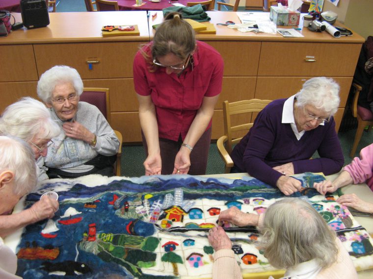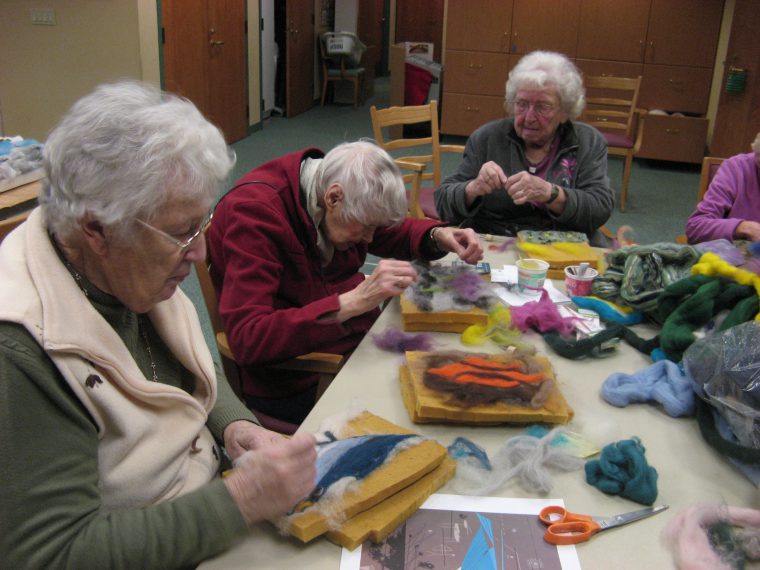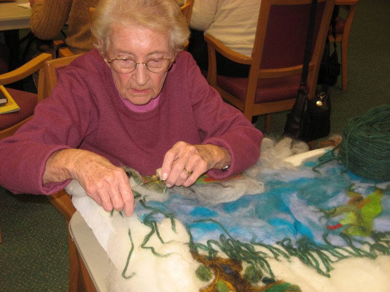 If you’ve ever mistakenly put your wool sweater in the wash, then you already have some idea of what felting is. Very simply, felt is matted wool. Wool becomes felt when it is subjected to moisture, heat, and pressure. The group at Renfrew Collingwood experimented with both wet felting and needle felting.