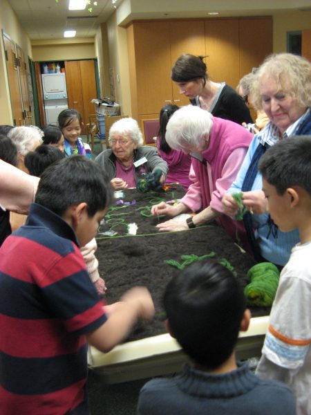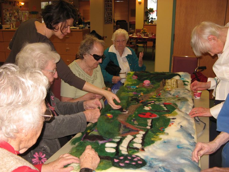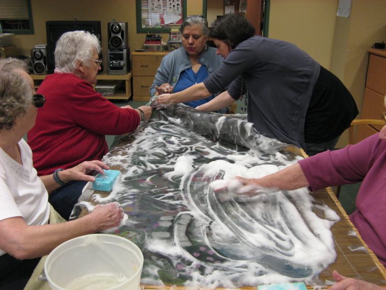 The group was led by Carmen Rosen and artist Emmanuelle Renard. Rosen has worked in community-engaged arts for over three decades and feels strongly about making art in her own neighborhood of Renfrew-Collingwood. “I took a felt-making workshop at Maiwa Handprints a few years ago,” she recalls, “and I knew that I would introduce this process to our group in the Arts and Health program.”