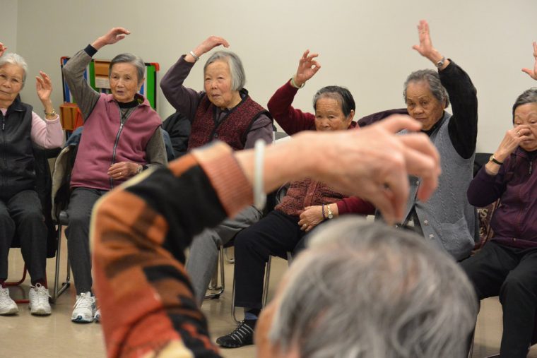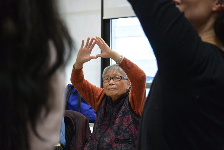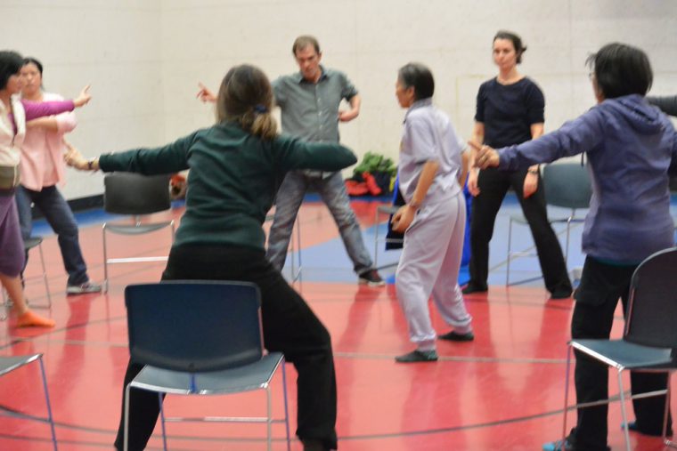 The elders in this multicultural dance group were people of all abilities living in the Downtown Eastside. The Arts & Health Project in partnership with the Carnegie Centre and Karen Jamieson Dance Society began coordinating the workshops at the Carnegie Centre gym in the fall of 2014, in collaboration with company dancers Mirae Rosner, Hailey McCloskey, Julie Lebel and Lindsey Ridgway. The lead dancers met, practiced, and planned together to develop dance practices that have the power to transform, to bring joy, and to heal. Then they shared and developed their discoveries in the dance workshops. All of these began with deep connection, as participants remained seated, paid attention to breath and connected the weight of their bodies with the pull of gravity. As they slowly began to swing and rock, they further connected with the earth’s magnetic pull and rebound energy, as they discovered new ways to get up and down with grace and ease.